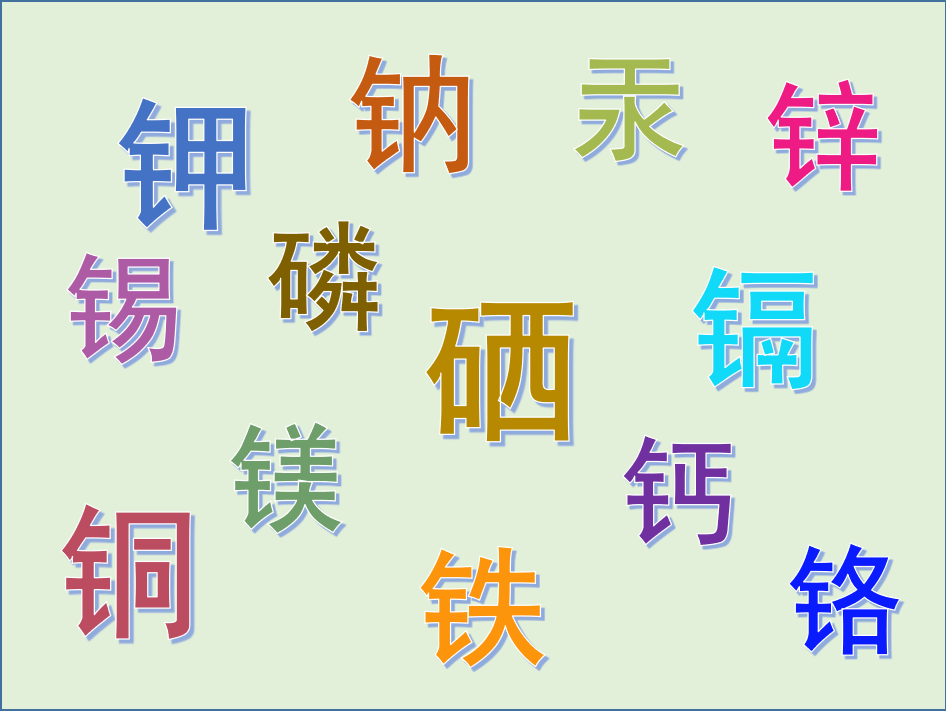 磷、鉀、鈉、鈣、鎂、鋁、銅、鐵、鎘、鉻、鋅、硒、錳等